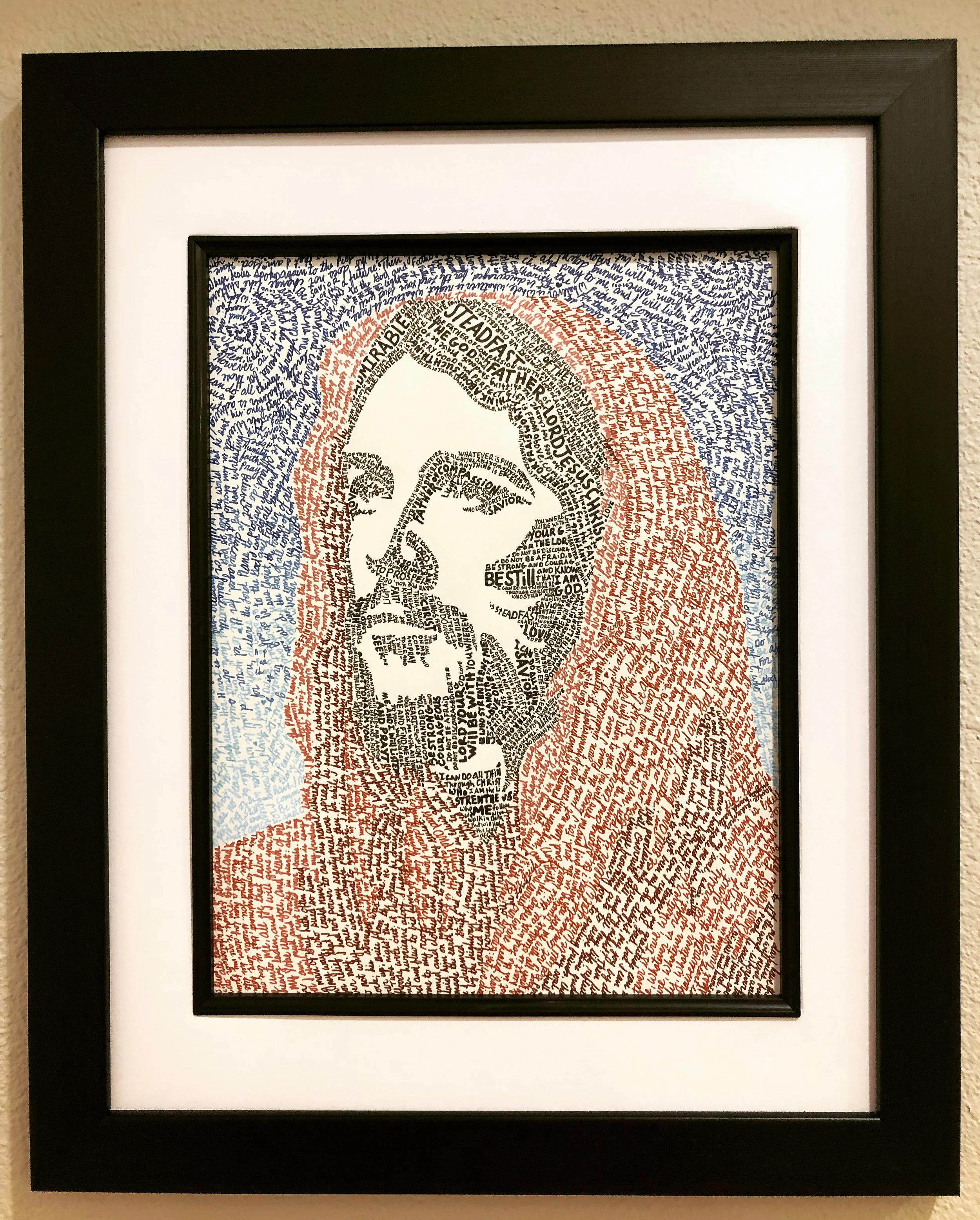 Look and Live: Viewing this word art design from afar you see a clear depiction of the Savior. As you walk toward the artwork, the clarity of the portrait gives way to composition of words and phrases. The idea is that we can easily see the Savior if we but look. However as we come closer to him we learn more about the gospel and what it means to be a disciple of Christ.